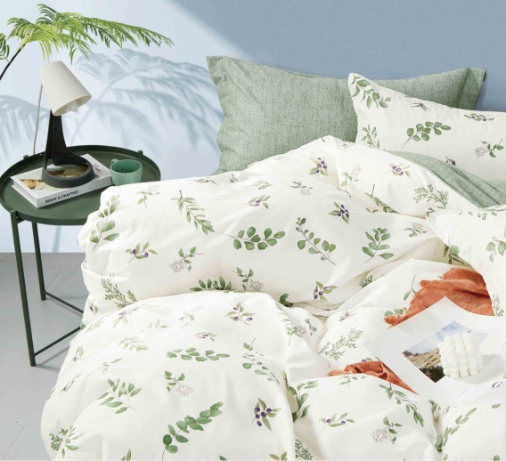 Pościel bawełniana biała w zielone liście 160x200 cm 3-częściowa #M1672
